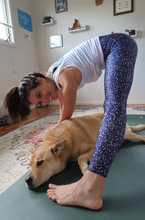 Adho Mukha Savasana or Downward-Facing Dog is a full body strength and stretch posture from your hands down to your toes and one pose that is widely recognized in yoga. If you have a family pet, I am sure that you witness them perform this posture multiple times a day to lengthen their spine and release tension. This staple posture helps calm the mind, releases stress, relieves headaches, insomnia and back aches and improves digestion, high blood pressure, flat feet and sciatica. Don't be fooled by its use as a resting posture between vinyasa practice, though; it can be a deep arm balance and partial inversion to challenge you, especially if holding for several minutes at a time.